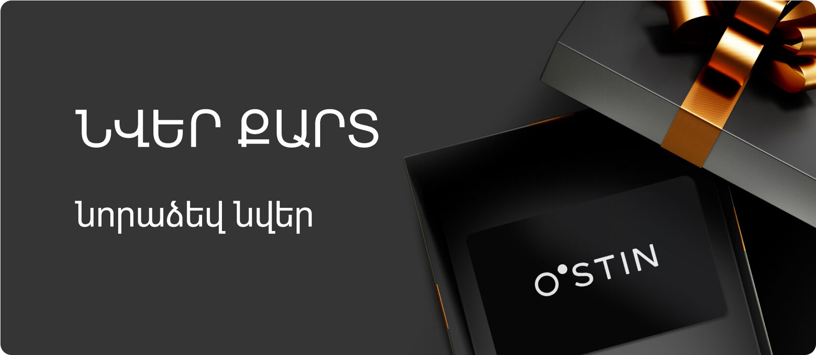 1. «O'STIN» նվեր քարտը (այնուհետև՝ Քարտ, Նվեր քարտ) պլաստիկ քարտ է, որը հավաստում է այն Ներկայացնողի՝ Հայաստանի Հանրապետությունում «O'STIN» խանութների տեսականուց միանվագ կարգով Քարտի անվանական արժեքի սահմաններում ցանկացած ապրանք ընտրելու և ստանալու իրավունքը՝ Քարտի գործողության ընթացքում: Քարտն ունի համար, անվանական արժեք և գործողության ժամկետ, որոնք նշված են քարտի դիմերեսին: «O'STIN» խանութների հասցեների մասին տեղեկությունը հասանելի է